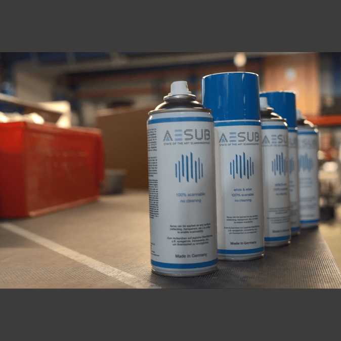 AESUB blue er en selvfordampende scanspray, udviklet af scanningseksperter. Sprayen fordamper inden for få timer, så der ikke er behov for rengøring efter scanning. I modsætning til traditionelle sprays indeholder AESUB blue ingen pigmenter og undgår dermed pigmentkontaminering af følsomme områder som laboratorier, produktionssteder, udstyr og brugere. Du kan derfor anvende AESUB blue direkte på scanningsstedet uden dyr transport for at undgå nævnte pigmentkontaminering i følsomme områder. Samlet set øger AESUB blue effektiviteten og produktiviteten betydeligt i digitaliseringsprocesserne.