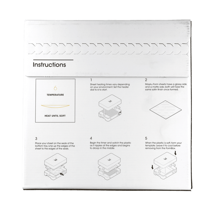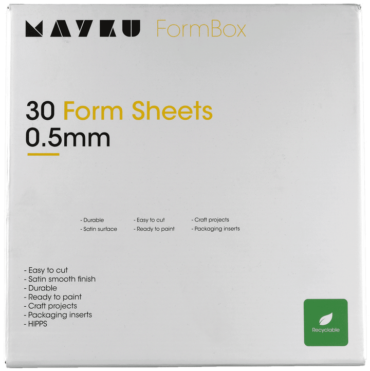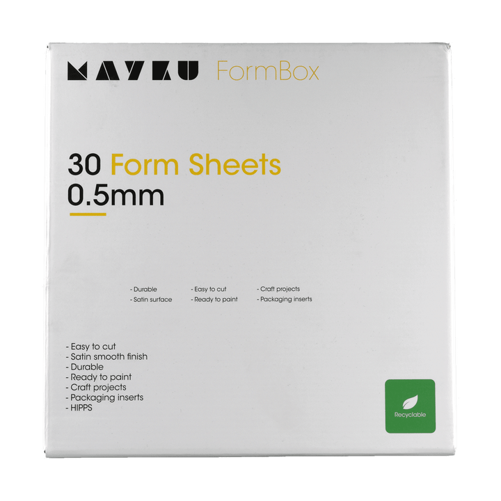 De Mayku FormBox Form Sheets er specielt udviklet til Mayku FormBox og tilbyder en holdbar, mat overflade til kreative og funktionelle projekter. Med en tykkelse på 0,5 mm er pladerne perfekte til produktemballage, prototyper og dekorative hobbyprojekter. Materialet er delvist lavet af genanvendt plastik og 100 % genanvendeligt – for bæredygtige resultater uden kompromis.