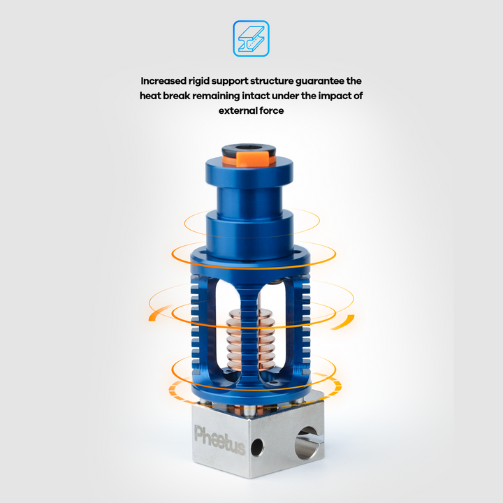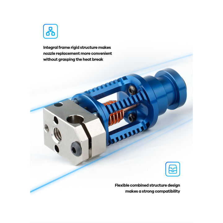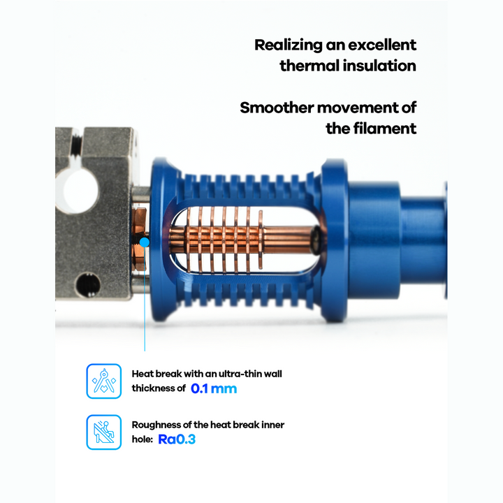 - Indvendig diameter på dysen og heat break på 0,4 mm for en jævn filamentstrøm og højere printopløsning.