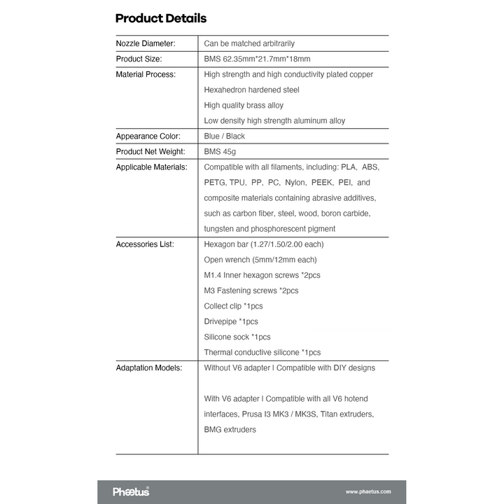 - Egnet materiale: Kompatibel med alle filamenter, inklusive PLA, ABS, PETG, TPU, PP, PC, Nylon, PEEK, PEI og kompositmaterialer med abrasive tilsætninger som kulfiber, stål, træ, borcarbid, wolfram og fosforescerende pigmenter.