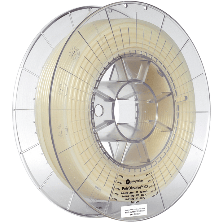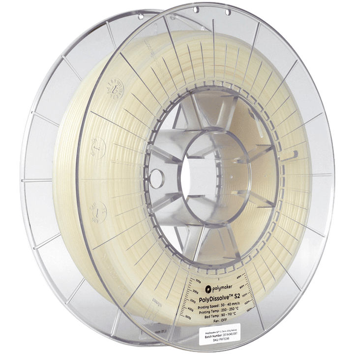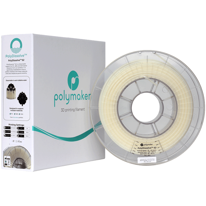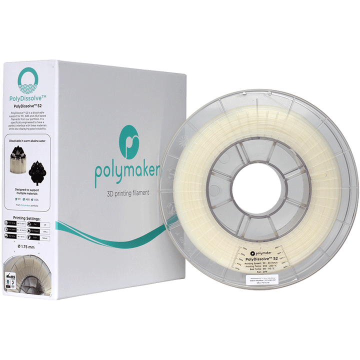 PolyDissolve™ S2 er et opløseligt støtte materiale, der er specielt udviklet til PC-, ABS- og ASA-filamenter fra Polymaker-porteføljen. Det sikrer perfekt materialekompatibilitet og opløses pålideligt efter print, så komplekse modeller bliver lettere at realisere.