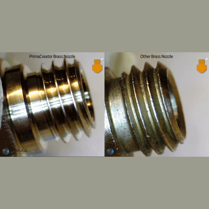 Alle PrimaCreator-dyser fremstilles af kvalitetsmessing eller stål (afhængigt af typen) og produceres i en topmoderne fabrik. Hver dyse produceres med en tolerance på mindre end ± 0,01 mm. Dette sikrer, at dit filament får en meget glat og klar overflade under ekstrudering, hvilket naturligvis fører til bedre udskriftsresultater.