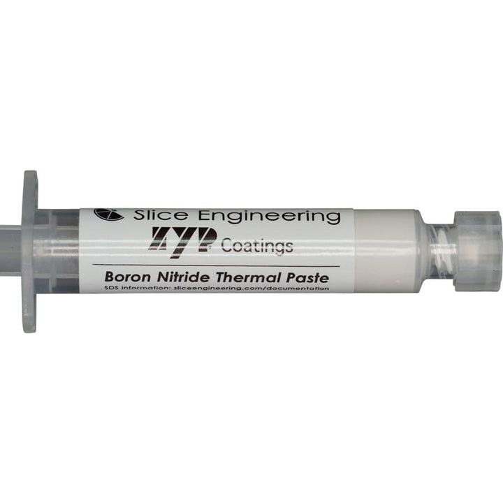 Slice Engineering Boron Nitride varmeledningstætning forbedrer varmeledningen og fungerer som adskillelsesmiddel. I modsætning til anti-seize forbindelser er Boron Nitride ikke elektrisk ledende, hvilket eliminerer risikoen for kortslutning i din varmepatron eller termistor.