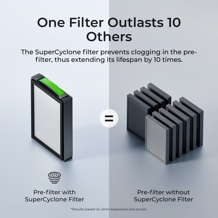 Kernen i AP2 er 6-lags filtersystemet, som renser luften ved at fange støv, allergener og skadelige dampe. Systemet omfatter SuperCyclone-filteret til store partikler, et filter med middel effektivitet til fint støv og et ultra-tæt kulstofnet, der fjerner lugte og VOC'er med en effektivitet på 99,99 %. På trods af dets kraftfulde filtreringsevner arbejder xTool SafetyPro AP2 med kun 55 dB, hvilket gør det ideelt til bolig- eller kontormiljøer, hvor støjniveauet skal minimeres.